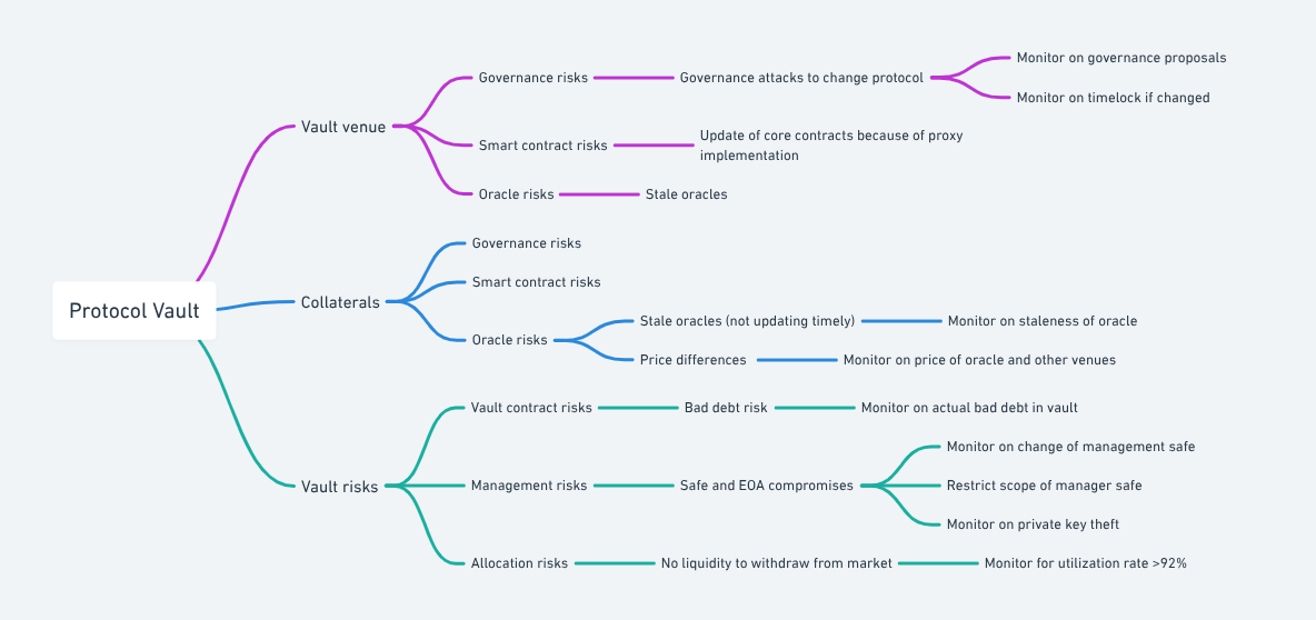 Vault risk monitoring targets vulnerabilities specific to the vault setup itself. kpk monitors for emerging bad debt, management key or Safe compromises, and liquidity constraints. For example, utilisation levels above 92% are flagged as potential withdrawal risk. Administrative permissions are strictly scoped, and changes to key control structures trigger alerts.